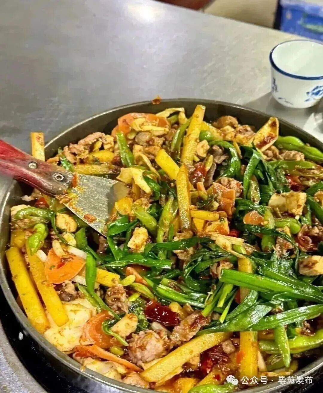 铁板烧,秘制的辣椒炒上土豆条、豆干、小瓜、牛肉、板筋、肥肠等,越炒越香,越吃越有味。加上一碗毕节特有的酸菜豆米汤,解腻又下饭。