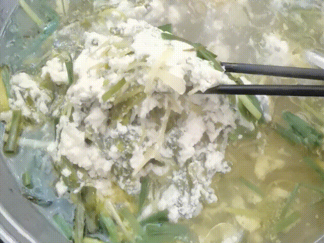 圆子莲渣闹,青菜和豆浆经过酸汤“点卤”做成菜豆腐,搭配一碗豆豉辣椒水,直接就是最佳减脂餐,还可搭配肉丸等食材,摇身一变荤菜豆花。