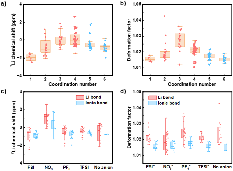 DFT计算揭示锂键与离子键的本质区别。研究发现<7>LiNMR化学位移呈普适的“火山型”变化趋势:锂的化学位移在CN = 4前后先增大后减小,区分了锂键(CN = 1、2、3或4)与离子键(CN = 5或6)主导的两种相互作用区域。深入分析发现,锂离子周围电子局域化区域对称性的变化是化学位移非单调行为的关键因素。此外,研究发现阴离子种类(如NO₃⁻)对<7>LiNMR化学位移的影响远大于常见溶剂分子,且这种阴离子的特异性影响无法单纯由电子局域化区域对称性的变化解释。