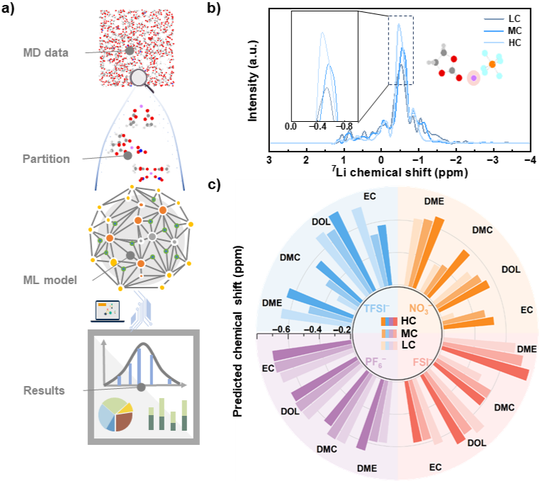 最后,研究者将MD模拟与机器学习模型相结合,成功预测48个电解液体系内<7>LiNMR化学位移的分布和平均化学位移,验证盐浓度对化学位移的影响趋势,与先前研究的计算和实验趋势吻合。这表明该模型不仅能定量关联原子级溶剂化结构与实验光谱数据,还可用于高通量筛选具有定制化溶剂化结构与高离子扩散率的先进电解液,为下一代高性能锂电池材料的理性设计提供高效计算工具与理论指导。