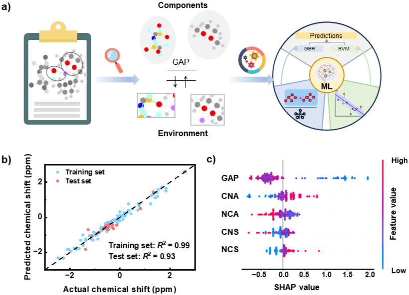 研究者开发可解释的机器学习模型,探究电解液组分调控锂键特性的深层原因,发现溶剂化结构中阴离子(NCA)和溶剂数目(NCS),阴离子(CNA)和溶剂各自的配位数(CNS),以及组分加权平均HOMO–LUMO能级差(GAP)是重要特征,建立能高精度预测<7>LiNMR化学位移的集成学习模型,并通过Shapley值(SHAP)分析方法揭示各输入特征对化学位移的贡献度,发现配位组分的加权平均HOMO–LUMO能级差是影响化学位移的最关键描述符,突显阴离子在调控锂离子局域电子环境中的重要地位。
