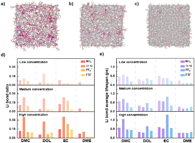 为证实锂键广泛存在并探究其形成规律,研究构建包含4种常见溶剂(DME、DOL、EC和DMC)和4种常见阴离子(NO₃⁻、PF₆⁻、TFSI⁻和FSI⁻)的48种电解液模型,涵盖低、中、高(1.05,2.01和4.02M)三种盐浓度。通过分子动力学模拟追踪统计锂离子在不同配位环境下的动态演变过程,验证锂键在电解液体系中的普遍存在性,发现盐浓度对锂键特性影响显著:随浓度从低到高增加,体系中锂键占比和平均寿命普遍提升。部分体系锂键占比从约3%增至超40%,平均寿命从约0.3ps延长至超1.0ps。对溶剂化结构分析表明,高盐浓度下阴离子更易进入锂离子第一溶剂化层,形成带负电的团簇结构,阻碍外部离子、分子渗透,增强锂键稳定性。