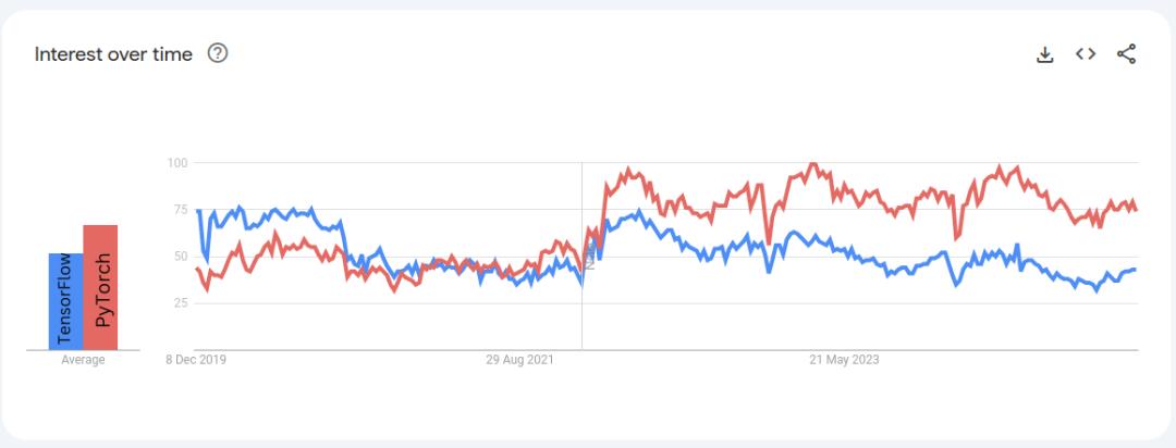 到2021年,TensorFlow在谷歌上的搜索量还高于PyTorch,然而现在PyTorch已经反超,搜索量几乎是TensorFlow的1.8倍。这是为什么呢?因为PyTorch把「灵活」和「直觉」带回了AI,它不像TensorFlow那样死板,能让研究者边写边改,实时调整实验模型。无数人第一次意识到:机器学习可以这么自由,像是创作。