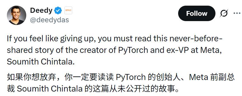 Soumith后来成了Meta的副总裁,手握全球最主流的AI框架,开源社区里无数人以他为榜样。但他始终不是那种典型的「硅谷成功学」主角,他话不多,不发鸡汤,也不热衷讲「如何逆袭」,更多时候,他只是安静地写代码、审PR、和社区开发者聊天。