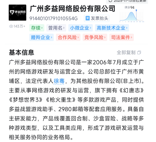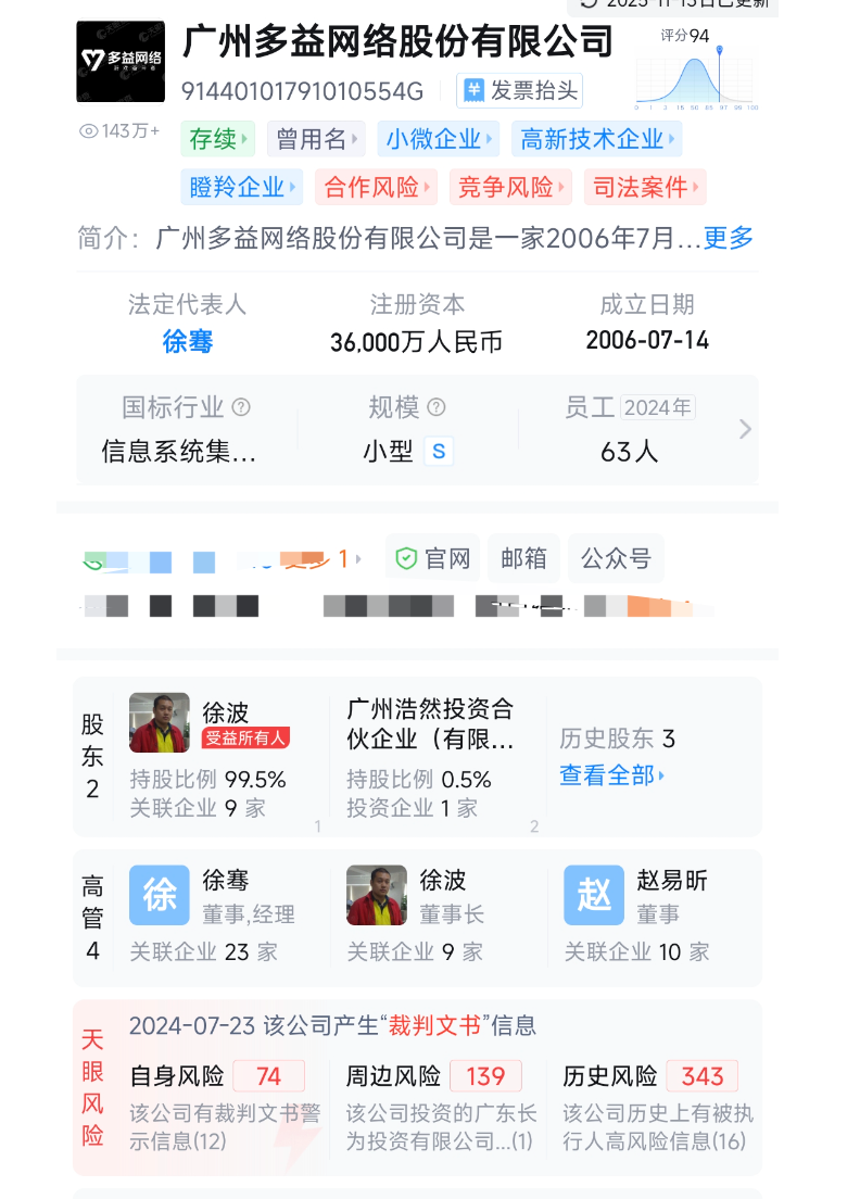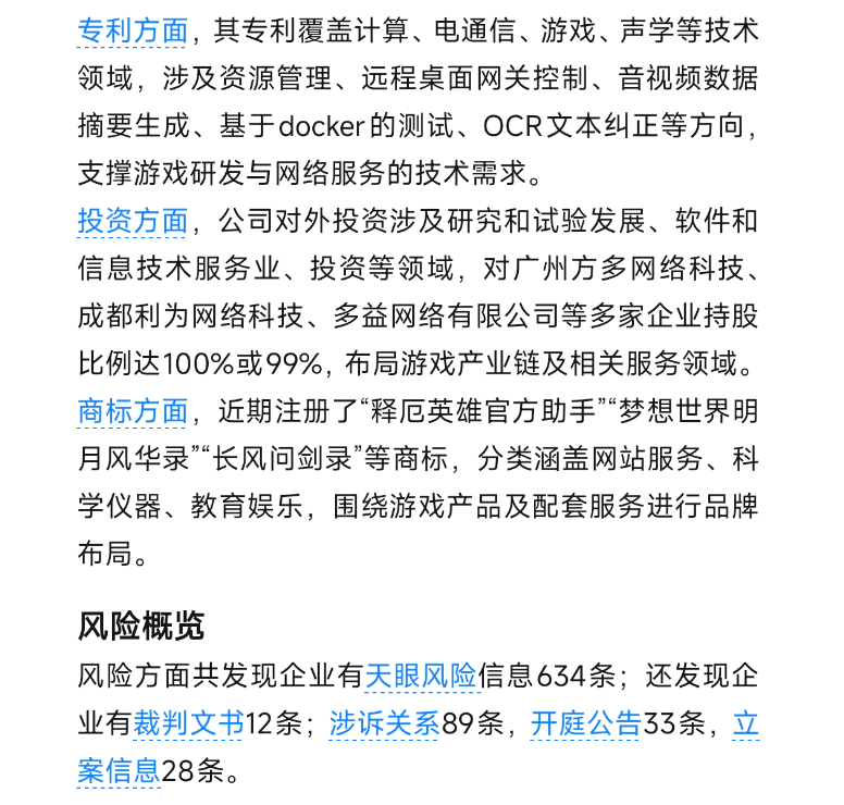 多益网络企业状况堪忧。天眼查数据显示,广州多益网络股份有限公司参保人数仅63人,天眼风险信息634条,裁判文书12条,涉诉关系55条。