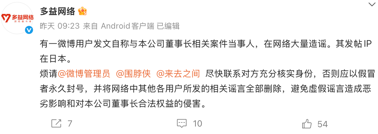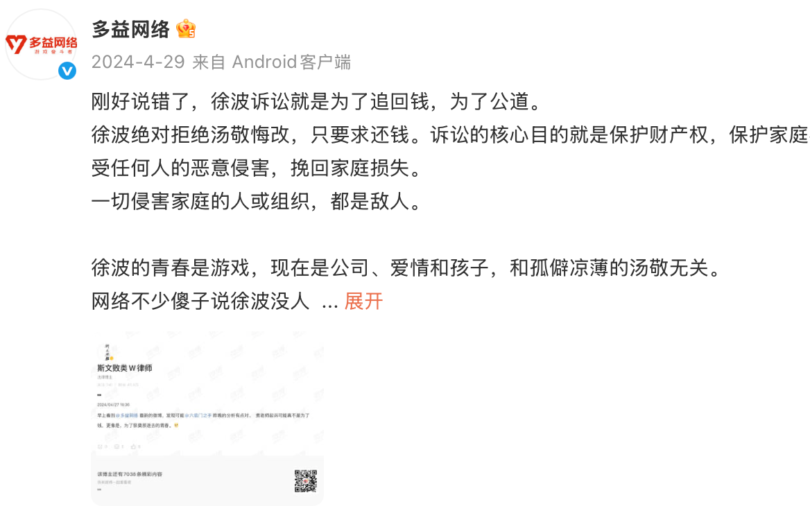 尽管一审有结果,纷争未止。11月16日,多益网络回应称相关账号内容造谣,要求平台处理。这场数亿元纠纷,在“借款”与“家庭”说法中,真相难明。