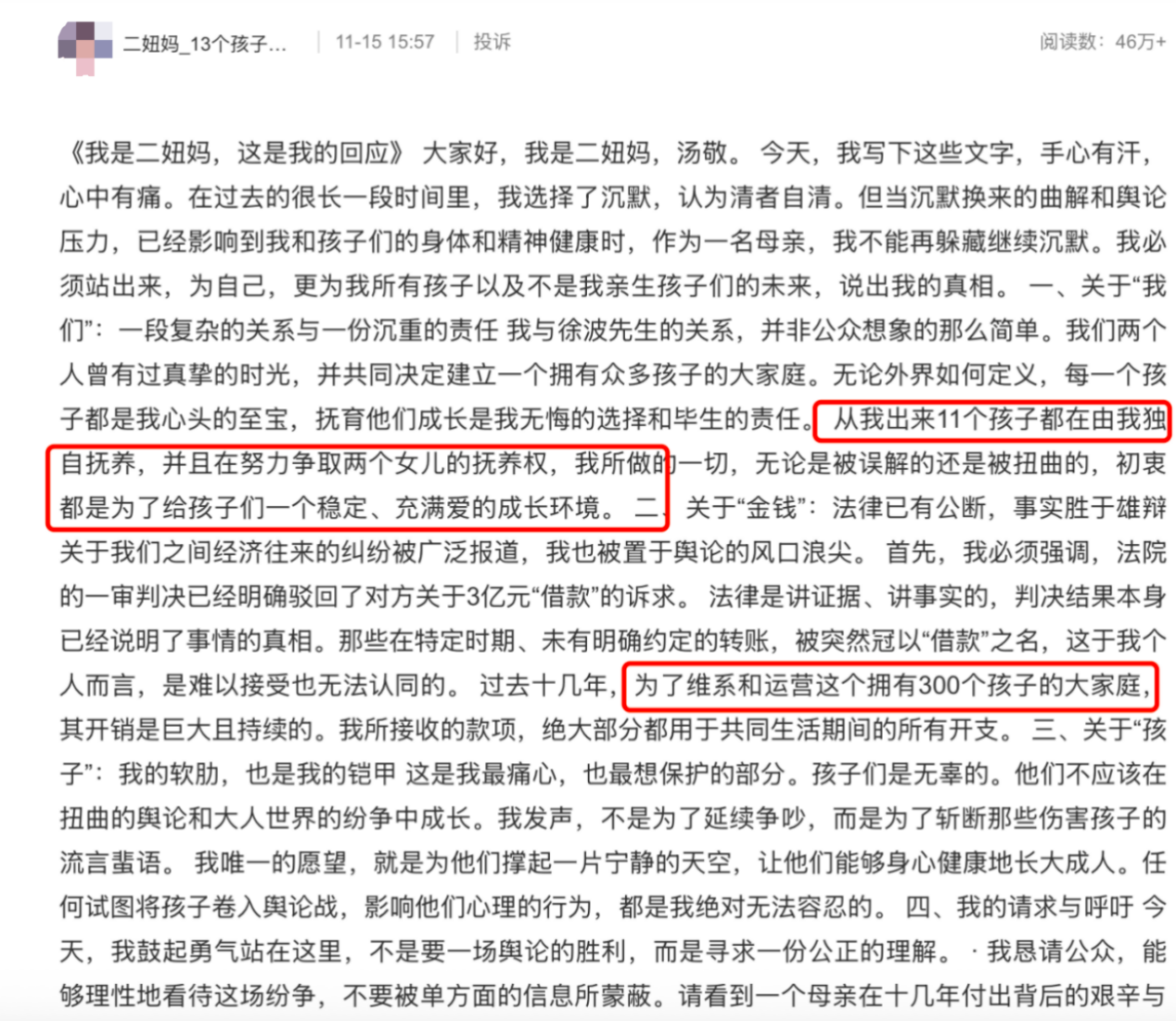 她独自抚养与徐波相关的11个孩子,还在争取两个女儿抚养权。她称站出来不是要舆论胜利,而是求公正理解。