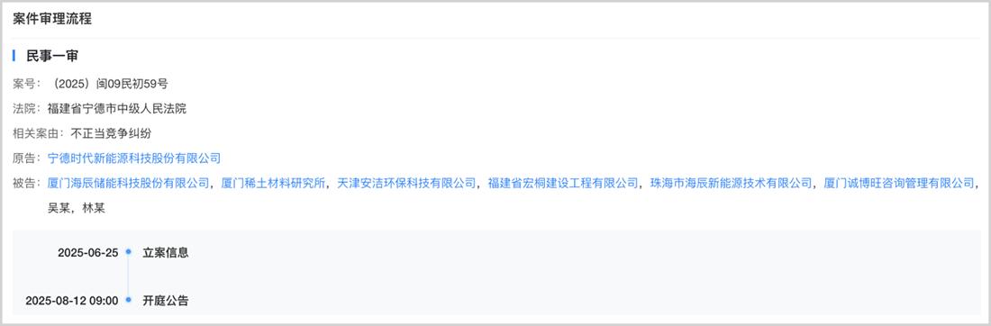 其中最新且金额最大的一起,是2025年6月,宁德时代以“不正当竞争”为由,将海辰储能及厦门稀土材料研究所等6名关联方告至宁德市中级人民法院。