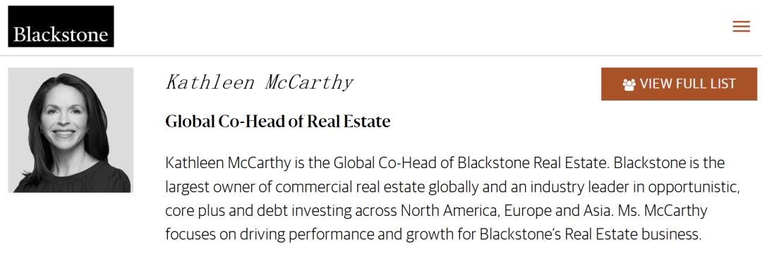 起初,Kathleen在黑石担任IR,4年后晋升为全球首席运营官,从纯粹投行人转变为驾驭庞大全球业务平台的领导者。2018年,她被任命为全球房地产联席主席,成为黑石帝国掌舵人之一。
