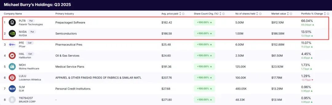 本月初,华尔街知名“空头”迈克尔·伯里披露了大量对英伟达的空头头寸。其旗下对冲基金Scion Asset Management第三季度持仓报告显示,该基金持有价值约9.12亿美元的500万股Palantir看跌期权和价值约1.87亿美元的100万股英伟达看跌期权(占其资产总值的80%)。