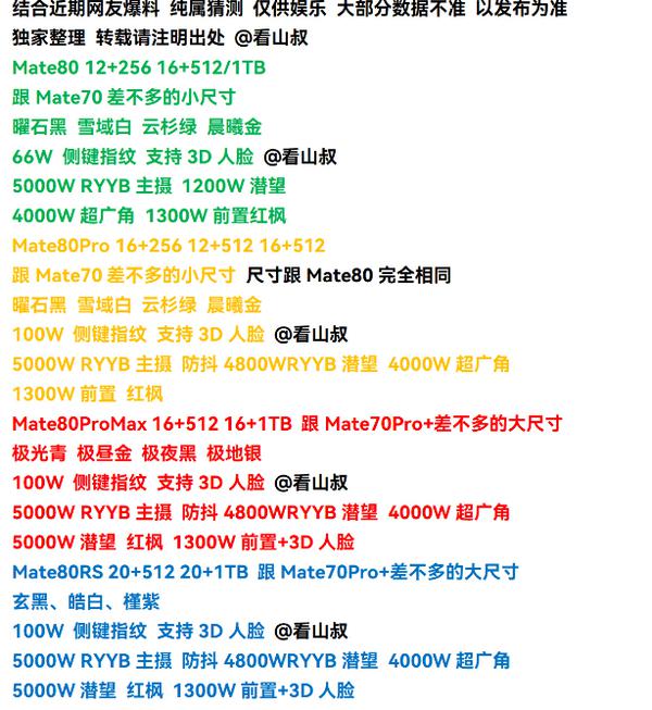 其中,Mate 80标准版预计采用和Mate 70相近的小尺寸设计,有曜石黑、雪域白、云杉绿、晨曦金等配色可选,搭载66W侧边指纹识别模块,还支持3D人脸识别功能。影像方面,主摄可能配备5000万像素RYYB传感器,潜望式长焦镜头支持1200万像素,前置摄像头为1300万像素,支持超广角拍摄。