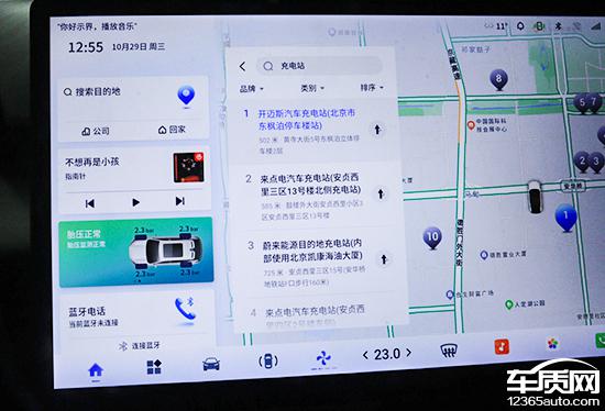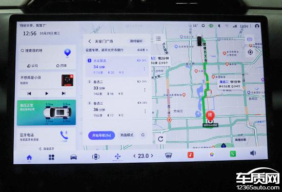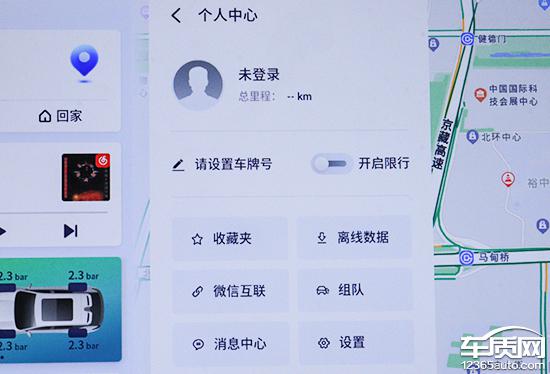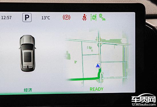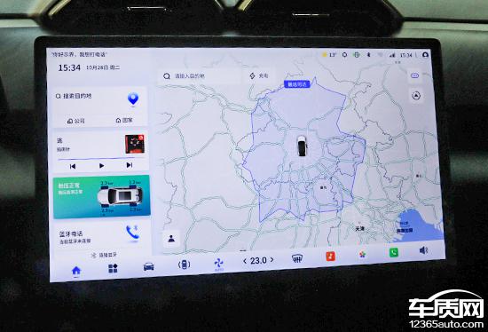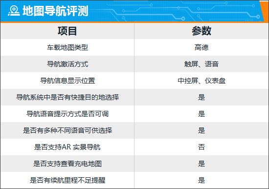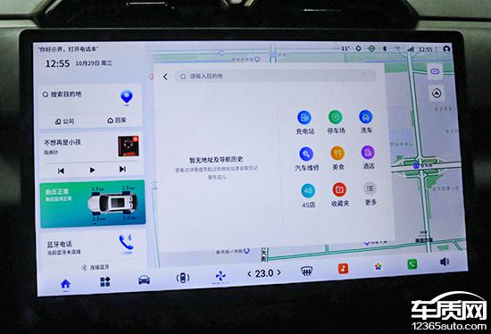 评测车内置高德地图,搜索栏在左上角,支持多种输入方式,操作简单。快捷目的地选择包括充电站、停车场、汽车及汽车维修等,能满足日常需求。