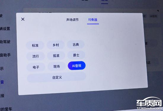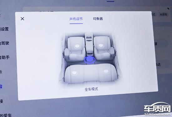 评测车搭载6扬声器音响系统,硬件配置一般。但软件层面表现出色,支持声场调节和均衡器。均衡器除了AI音效预设内容,用户还可自定义设置,可玩性高。