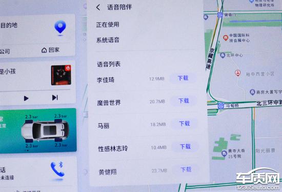 除中控屏外,液晶仪表屏幕也能显示导航信息,包括地图和路线指引。导航系统支持微信互联和组队功能,实用性尚可。此外,“语音陪伴”设置界面支持语音列表选择,内容丰富,下载语音包后即可使用。