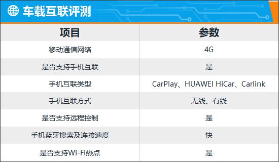 车载互联方面,评测车配备4G网络,支持车联网、OTA升级、Wi-Fi热点和手机APP远程功能。实测蓝牙搜索及连接速度快,使用感受好。手机互联支持CarPlay、HUAWEI HiCar和Carlink,兼容性不错。