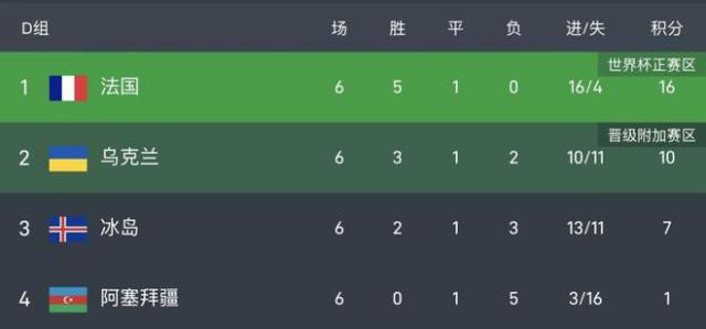 D组最终结果,法国积16分已提前出线,乌克兰击败冰岛后积10分,获得附加赛资格。冰岛积7分,阿塞拜疆积1分,两队双双出局。