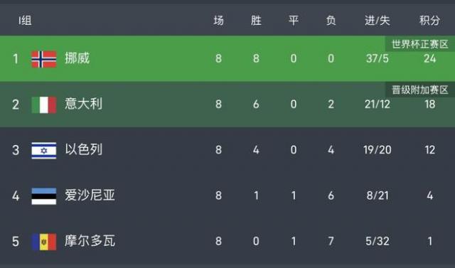 I组最终情况,挪威双杀意大利,8战全胜积24分,时隔28年重返世界杯,意大利积18分,连续三届参加附加赛。以色列积12分,爱沙尼亚积4分,摩尔多瓦积1分,这些球队全部出局。