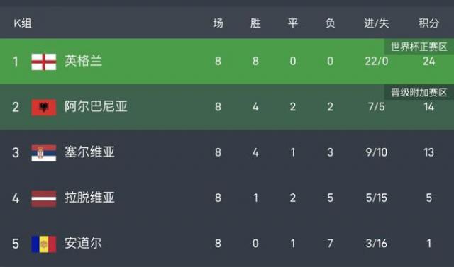 K组比赛落幕,提前出线的英格兰8战全胜积24分,阿尔巴尼亚积14分,同样提前锁定附加赛资格,塞尔维亚积13分,拉脱维亚积5分,安道尔积1分,这些球队都已提前出局。