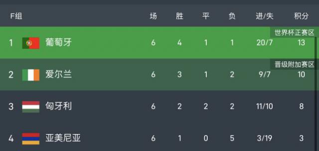F组比赛结束,葡萄牙积13分,直接获得世界杯参赛资格,爱尔兰绝杀匈牙利后积10分,锁定附加赛资格。匈牙利积8分,亚美尼亚积3分,两队均无缘后续比赛。