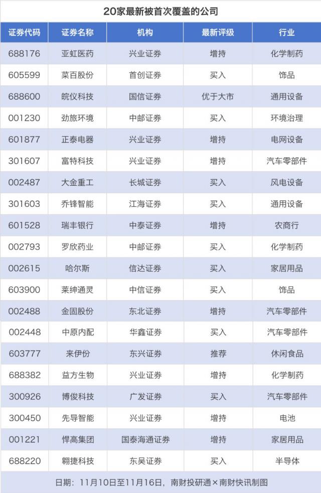 首次覆盖方面,11月10日至11月16日,券商共给出91次首次覆盖。其中,亚虹医药、正泰电器获得兴业证券分别给予的“增持”“增持”评级,菜百股份获得首创证券给予的“买入”评级,皖仪科技获得国信证券给予的“优于大市”评级,劲旅环境获得中邮证券给予的“买入”评级。