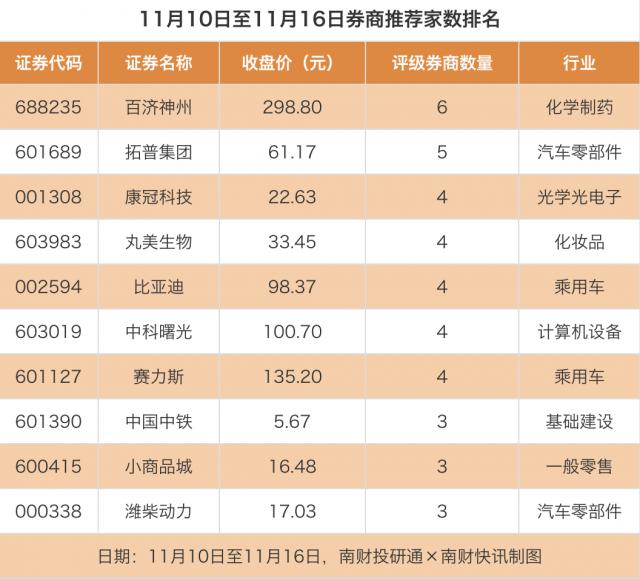 从券商推荐家数来看,11月10日至11月16日,有586家上市公司获得券商推荐。其中,百济神州获得6家券商推荐,拓普集团获得5家推荐,康冠科技获得4家推荐。