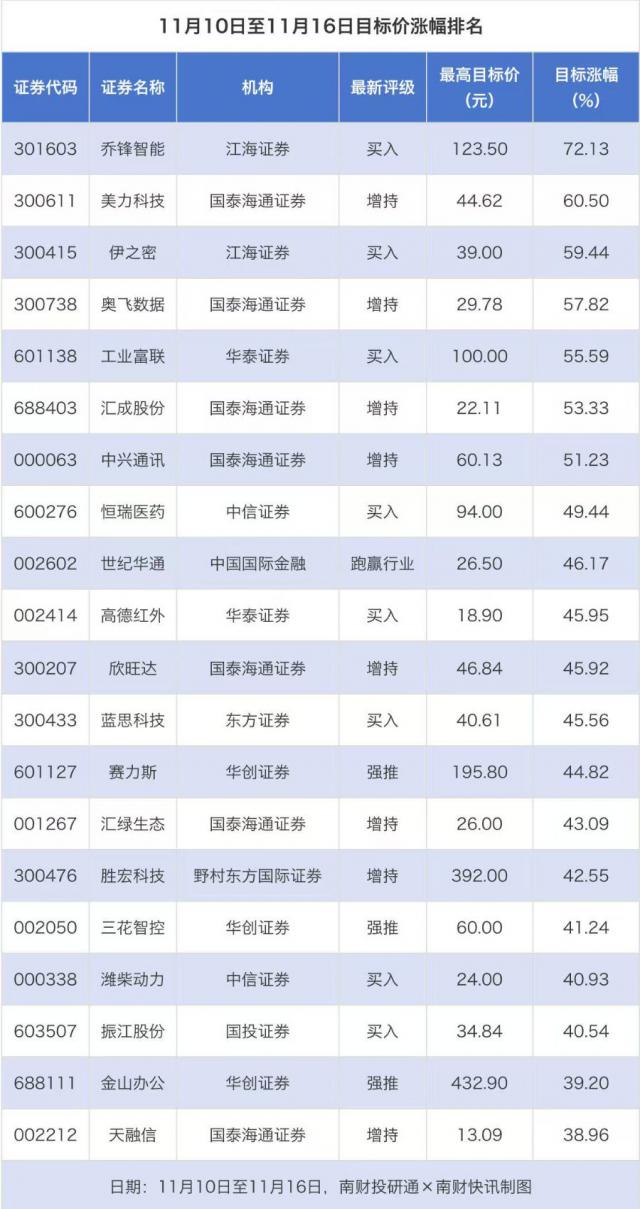 南财投研通数据显示,在11月10日至11月16日期间,券商对上市公司给出目标价共计127次。按照最新收盘价计算,目标价涨幅排名靠前的公司有乔锋智能、美力科技、伊之密,目标价涨幅分别达到72.13%、60.50%、59.44%,它们分别属于通用设备、汽车零部件、专用设备行业。