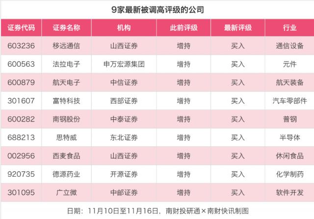 在评级调高方面,11月10日至11月16日,券商调高上市公司评级达9家次。最新数据显示,山西证券将移远通信的评级从“增持”调高至“买入”,申万宏源集团将法拉电子的评级从“增持”调高至“买入”,中信证券将航天电子的评级从“增持”调高至“买入”。