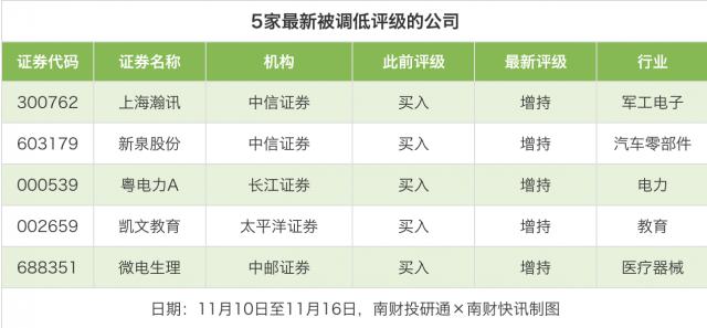 评级调低方面,11月10日至11月16日,券商调低上市公司评级有5家次。最新数据包括中信证券将上海瀚讯的评级从“买入”调低至“增持”,中信证券将新泉股份的评级从“买入”调低至“增持”,长江证券将粤电力A的评级从“买入”调低至“增持”。