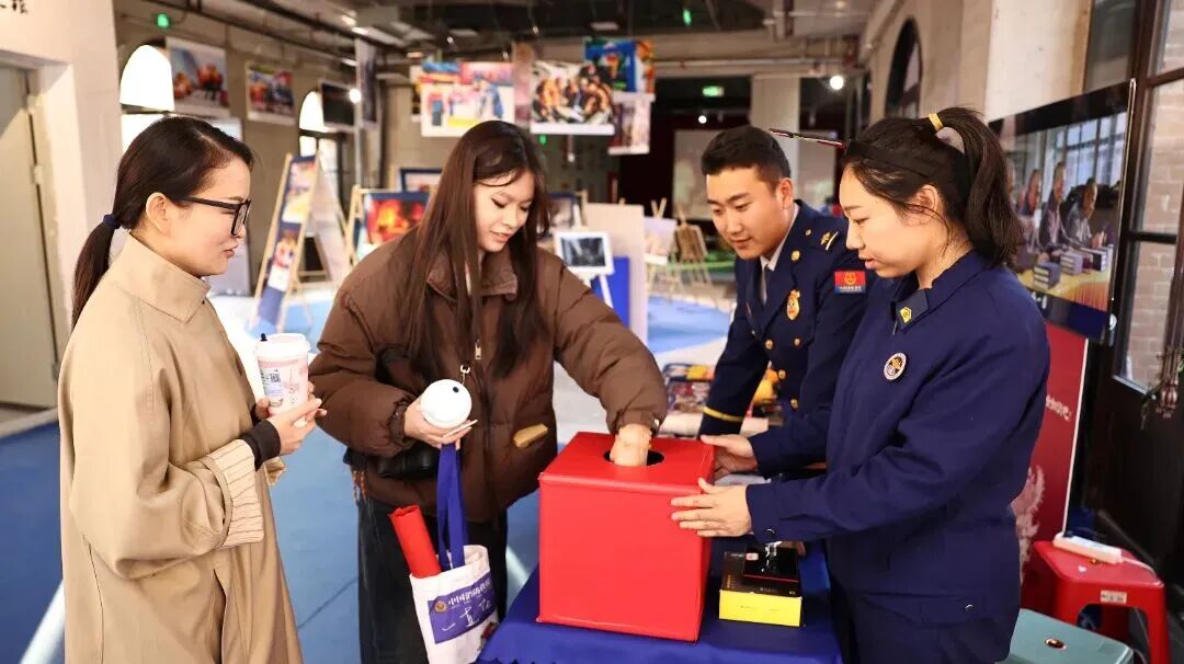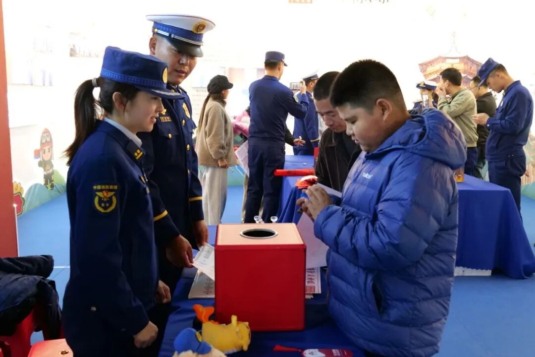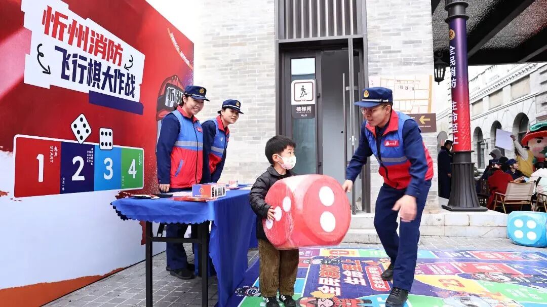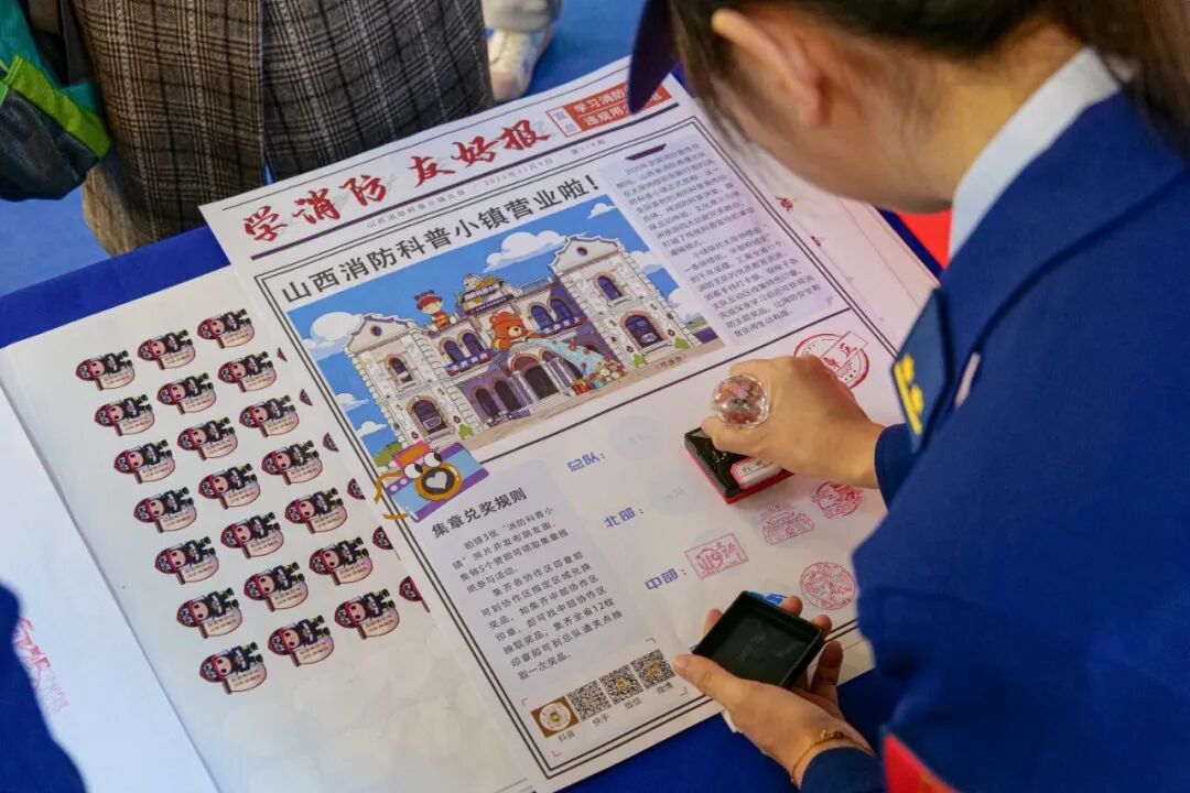 北部协作区展区,朔州、大同、忻州支队将应县木塔、云冈石窟、五台山等古建筑的千年防火智慧引入小镇。现场搭配川剧变脸、防火快板等非遗表演,还有沙包灭火弹、拼图、飞行棋等互动游戏。更棒的是,集三个支队印章后可上二楼抽奖赢文创,让消防科普从“古城韵味”延续到“钟楼潮玩”,既好玩又有知识!