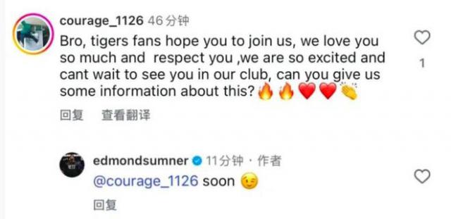 有球迷在萨姆纳的社媒留言询问,表达了广东队球迷希望他能加盟球队的热切期盼,大家都很兴奋,期待能在俱乐部见到他,并希望他能给一些消息。