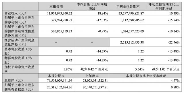 最新财报显示,今年前三季度,公司实现营收332.97亿元,同比增长10.39%;归母净利润为11.13亿元,同比减少15.94%。