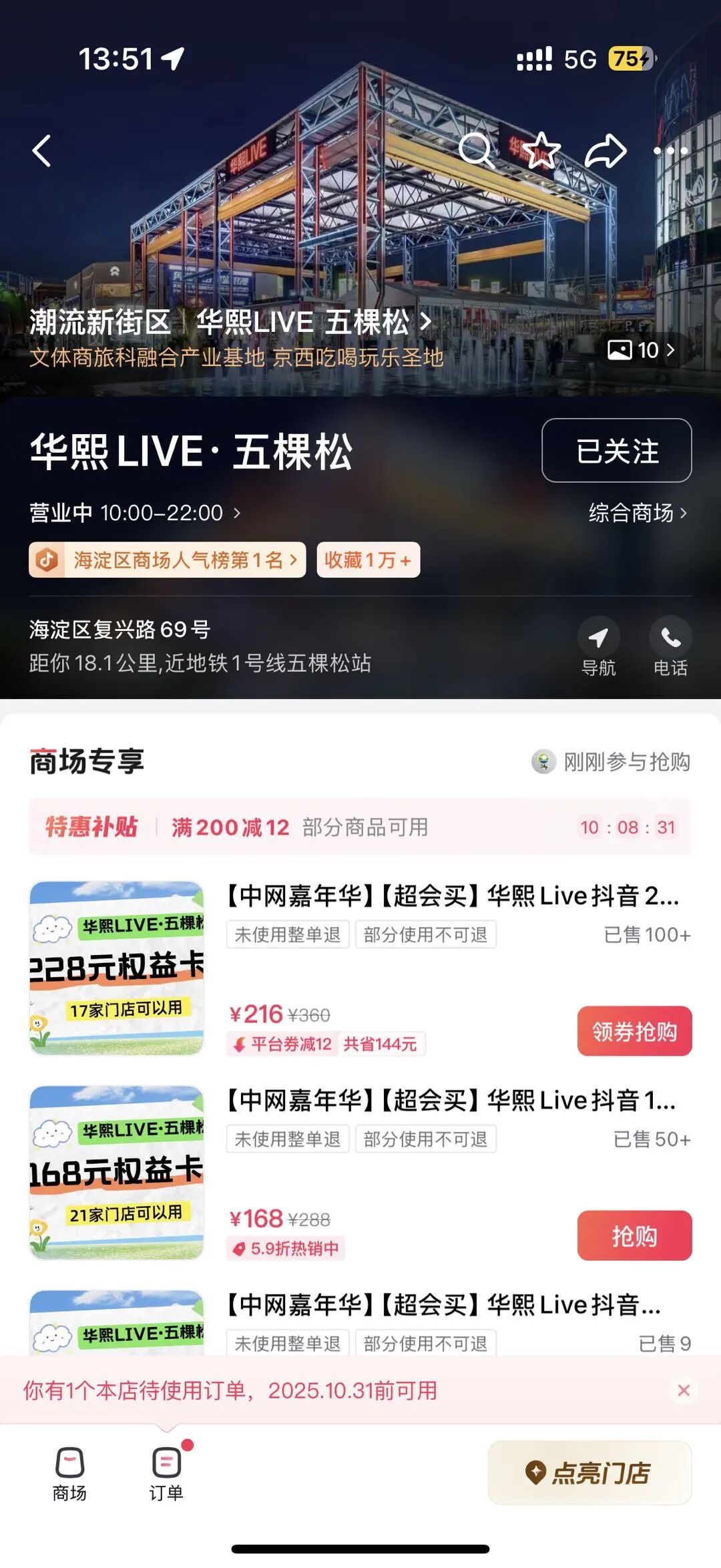 为此,抖音生活服务平台不仅在线上整合了商圈商家和优质打卡内容,还特别推出了「权益卡」产品。以华熙LIVE·五棵松为例,在十一黄金周期间推出了168/228元等不同价位的专属权益卡,权益卡包含正餐品牌多选一、饮品品牌多选一、综合休娱体验类服务N选N,用户可以在正餐、饮品和休闲娱乐项目中自由搭配,真正实现「一卡逛遍商圈」。