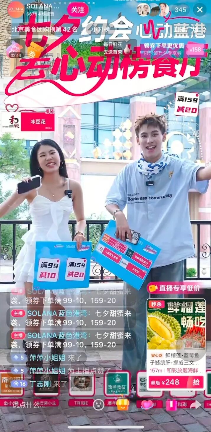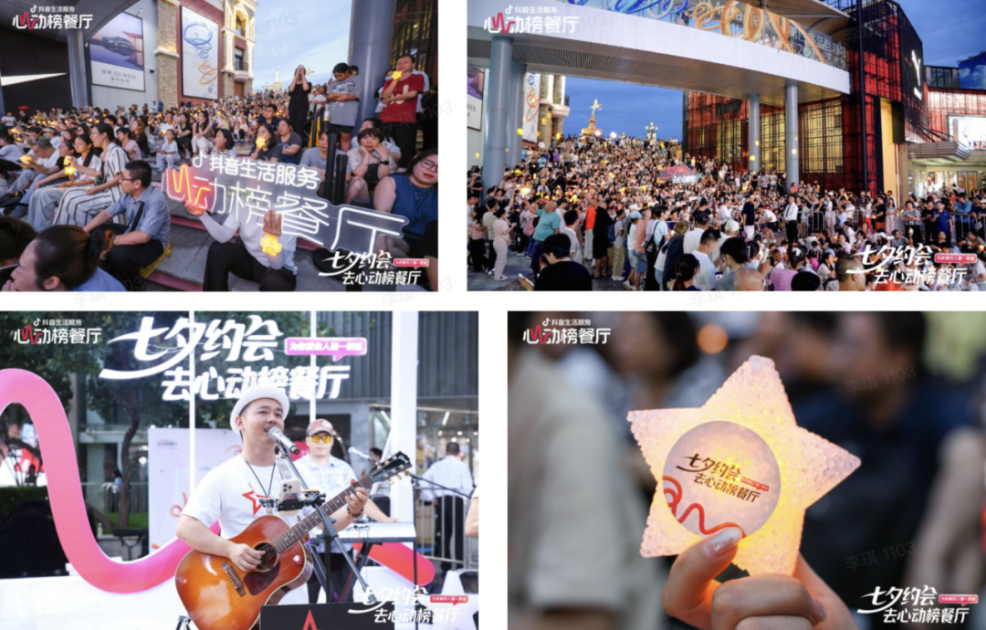 蓝色港湾与抖音合作,结合热门IP「星光音乐会」举办七夕主题活动。郑哲伦表示,现场节日浪漫氛围十足,带动当日客流增长超过两成。合生汇联合抖音,与B1、B2层的「21街区」的200余家拉面、炸串、盖浇饭等店铺合作,推出「七夕约会去合生汇」主题活动,将分散的消费场景重新组合成一个「节日事件」,再通过直播一次性发券,转化率大幅提升。