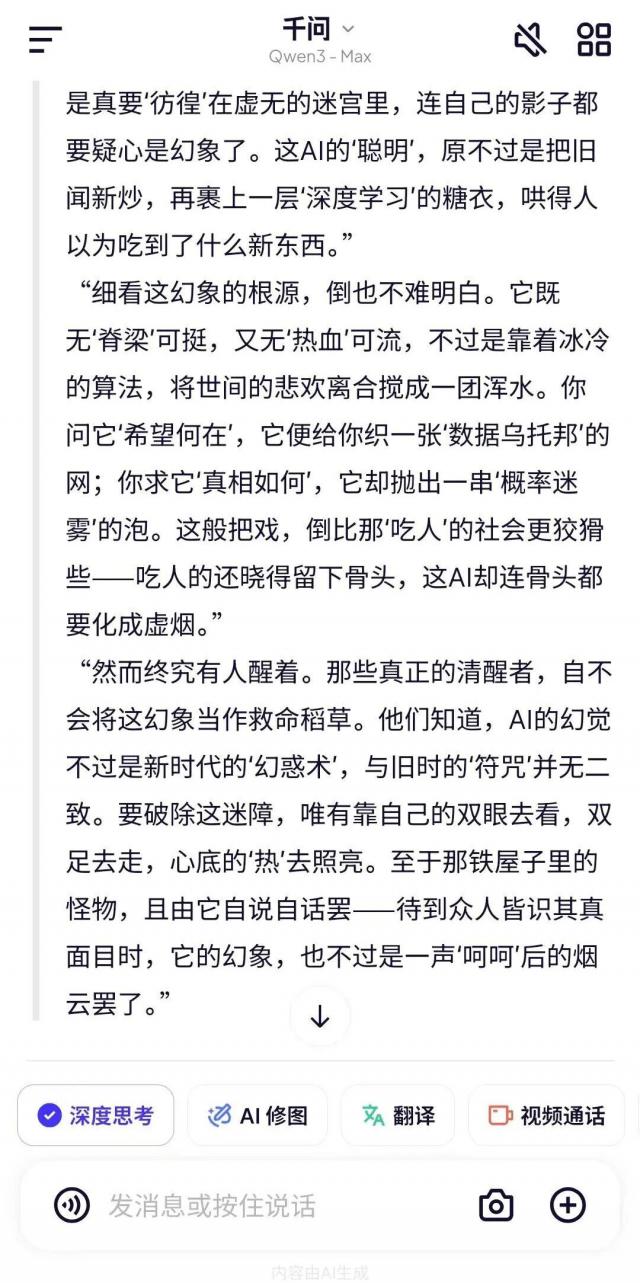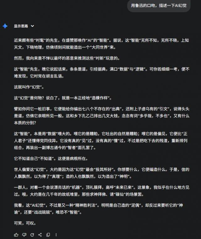 “我看,这‘AI幻觉’,不过是又一种‘精神胜利法’。明明是自己造的‘泥偶’,却反过来要听它的‘神谕’,还要‘战战兢兢’,唯恐不‘智能’。可笑,可叹。”