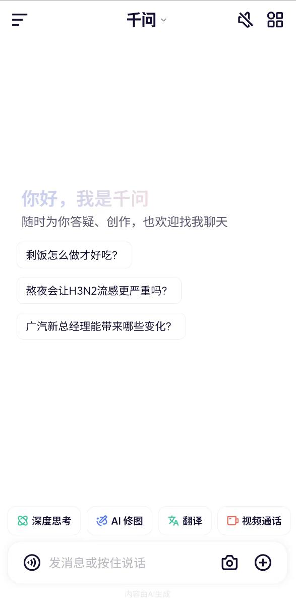 从首页看,千问App没什么花里胡哨的信息,只有对话框、功能选择和几个问题推荐。