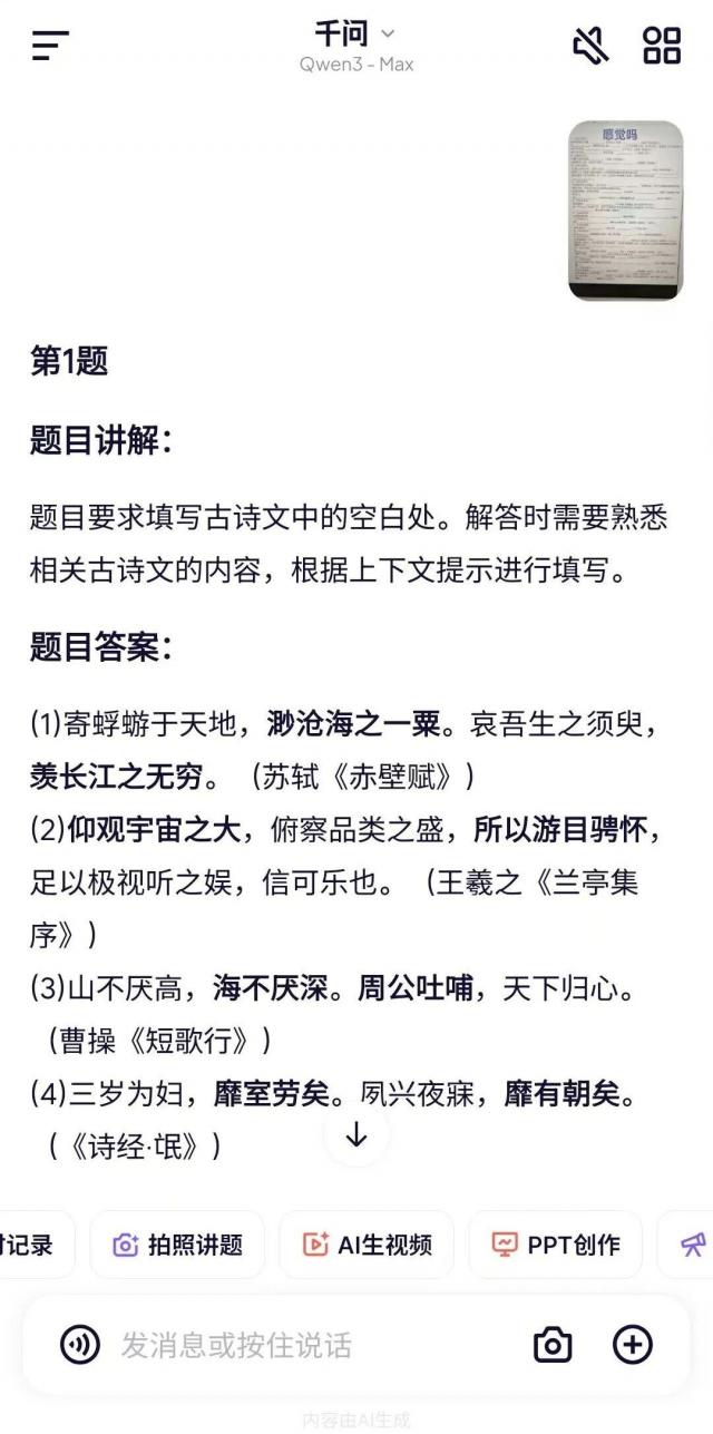 千问的多模态能力也很强。我找了张小时候的练习题,发给千问,它很快就全做出来了,实力惊人。