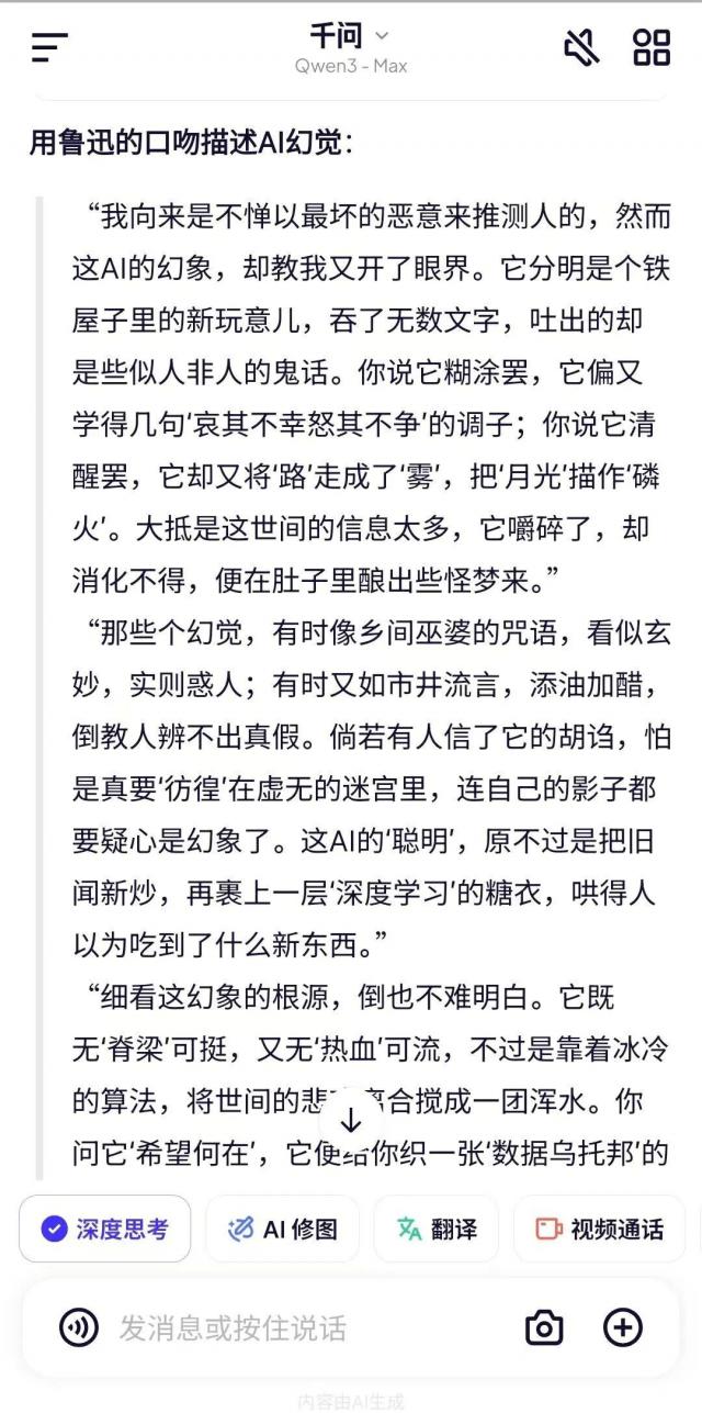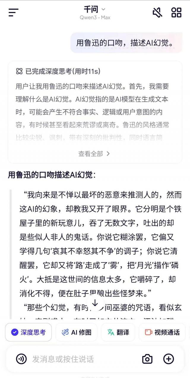AI幻觉很烦人,我用迅哥儿的语气吐槽AI幻觉。千问的回答很有味道,结尾还有对大伙的呼吁,有点《热风》里“摆脱冷气”的感觉。
