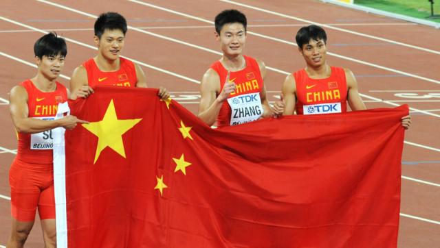2015年北京田径世锦赛,由苏炳添、谢震业、张培萌、莫有雪组成的中国队夺得4×100米接力银牌(视觉中国)
