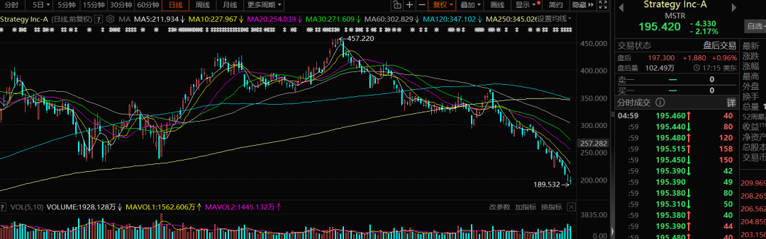 与此同时,“炒币”的美股上市公司也遭遇猛烈抛售。美东时间11月14日,全球最大的“比特币财库”公司MicroStrategy(MSTR)股价大跌超4%,过去一个月的累计跌幅扩大至32.69%。