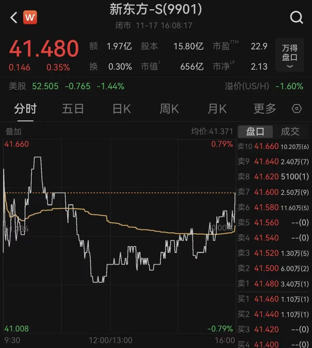二级市场上,11月17日,港股新东方收涨0.35%,报41.48港元,最新市值为656亿港元。