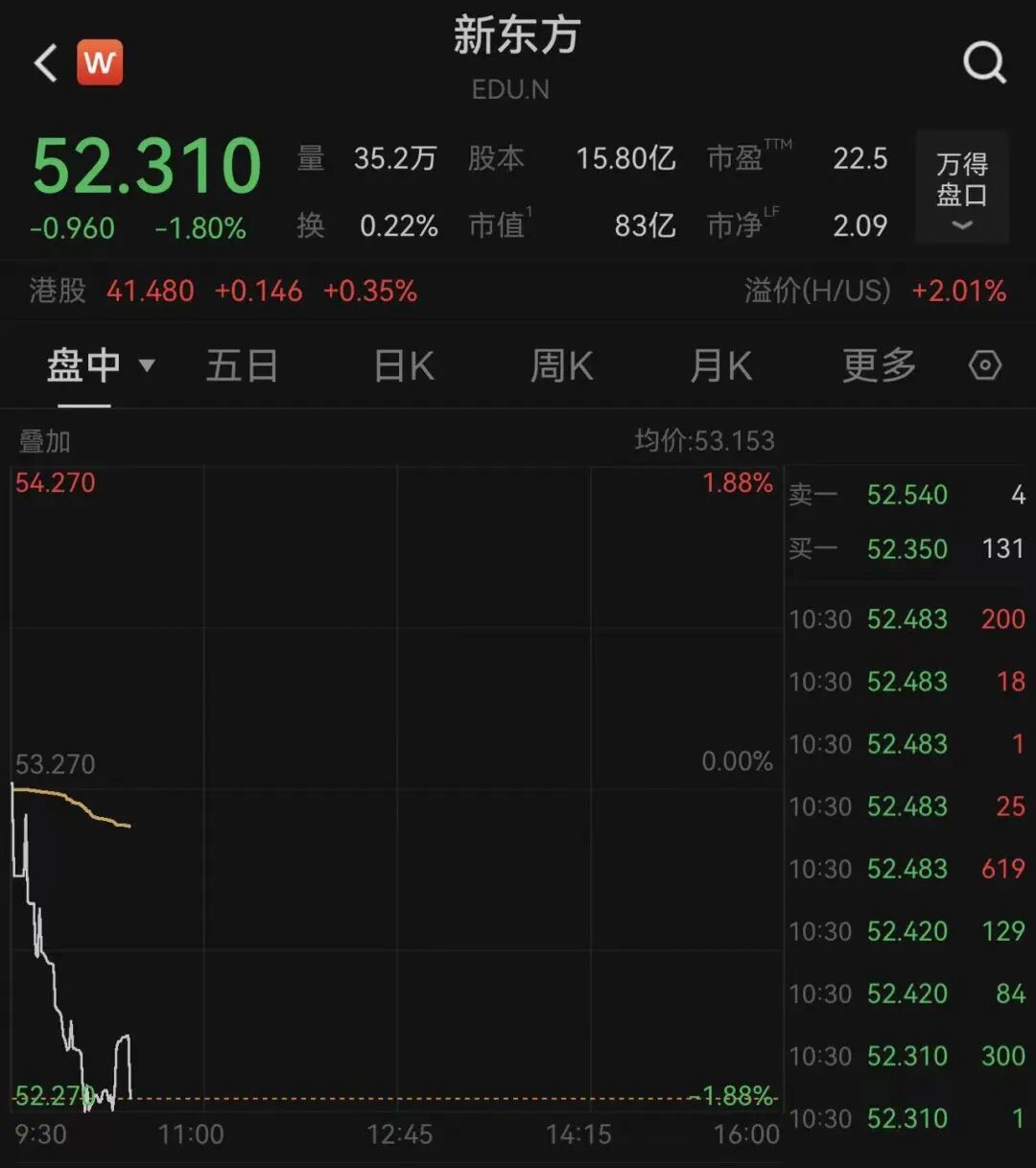 截至发稿,美股新东方跌1.8%,报52.31美元,最新市值为83亿美元。