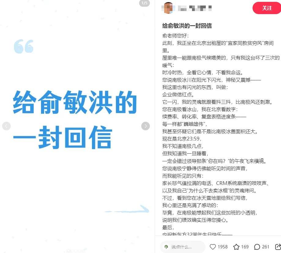 “老板在南极,员工在加班。”这是不少网友在看到俞敏洪的最新全员信后的第一反应。