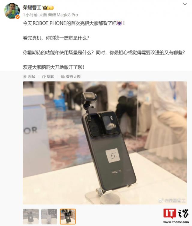IT之家11月17日消息,据荣耀研发工程师@荣耀曹工透露,ROBOT PHONE今日首次亮相。工程师还公布了该机的早期手板照片,其中第五版的造型和10月15日荣耀Magic8系列发布会上亮相的Magic8 AI概念版手机ROBOT PHONE极为相似。