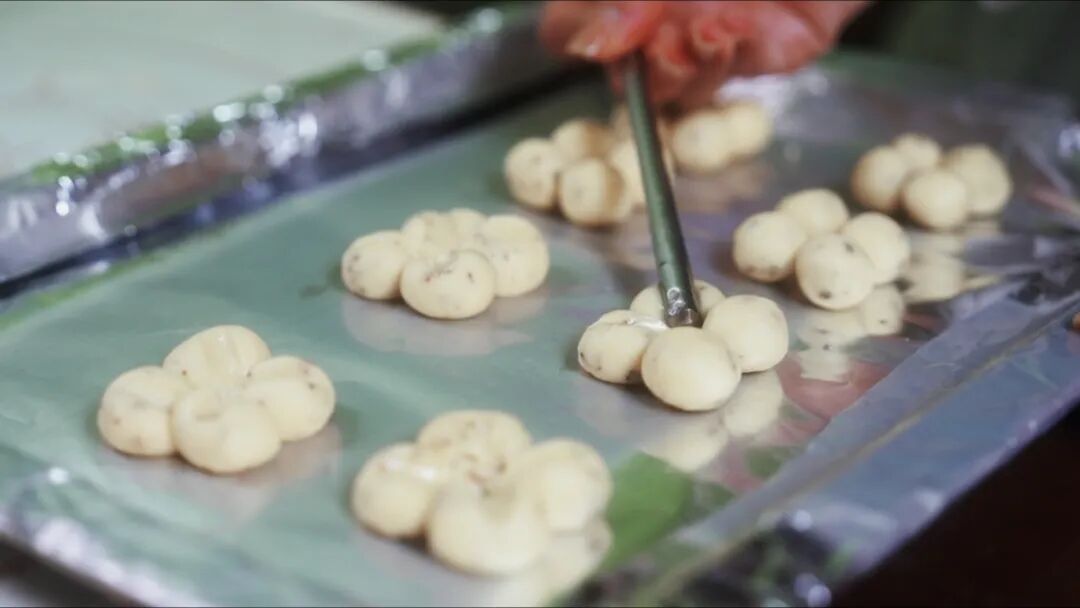取一小团面团,用筷子轻轻压出花瓣般的纹路,再在顶端放上几粒带着晨露的新鲜桂花,将秋日的鲜活与诗意都凝聚在这小小的曲奇上。