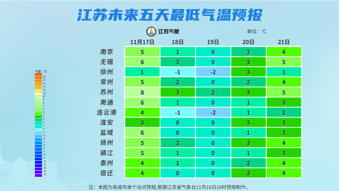 据江苏气象消息,受强冷空气影响,我省有明显大风降温过程。18 - 19日早晨气温较低,徐州和连云港最低气温仅有 -1到 -2℃,大部分地区有霜或霜冻。