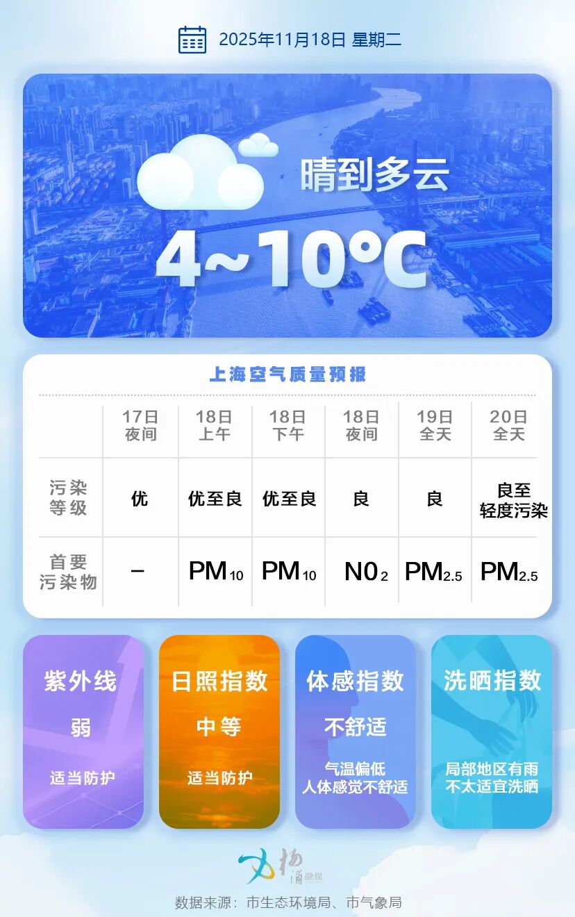 今日晴到多云,西北风4 - 5级阵风6级,沿江沿海地区5 - 6级阵风7级,预计最高气温10℃。相对湿度70% - 30%,空气干燥,注意补水润燥。早间寒冷,市区4℃,郊区更冷,要穿暖和些~