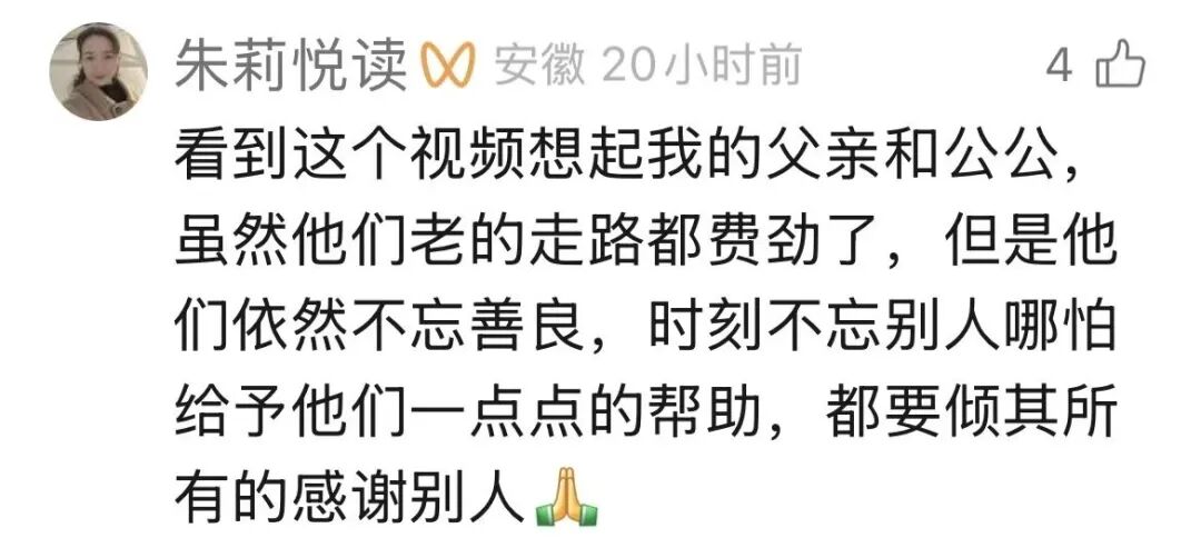视频发到网上后,网友纷纷暖心评论:“永远善良淳朴的心”“刻在骨子的善良”。