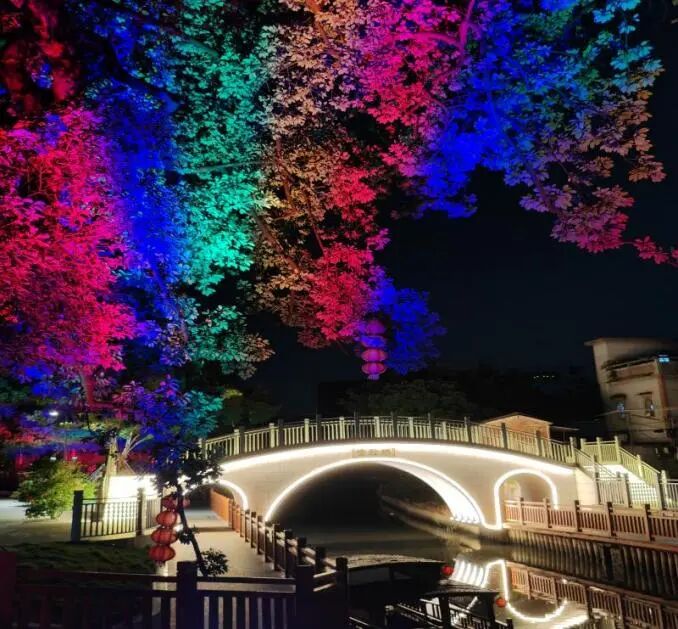 灯光艺术包括重力感应钢琴灯、七彩榕树、月亮秋千、时光隧道等。整片古村化身光影剧场,您可以在七彩古榕下许愿,在德秋桥上漫步,感受灯光与星空的温柔对话。
