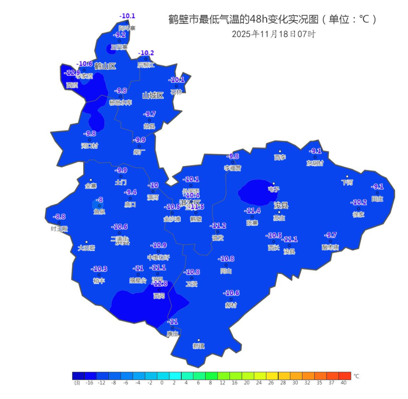 受强冷空气影响,在11月16日至18日7时,我市遭遇了寒潮和大风天气。大部分站点48小时最低气温的降温幅度超过了10℃。今天早上,全市最低气温普遍低于0℃,其中鹤山区阿斗寨站的温度最低,达到了零下7.8℃。具体情况如下: