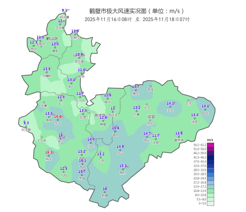在11月16日8时至18日7时,我市还出现了大风天气。有21个气象观测站点的极大风速达到了7级以上,淇县夺丰水库站的极大风速最大,为16.6米/秒。具体情况如下: